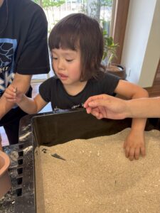 砂の中から本物のサメの歯を見つけ出す化石堀体験では、子供たちが真剣な表情で宝探しを楽しんでいました。